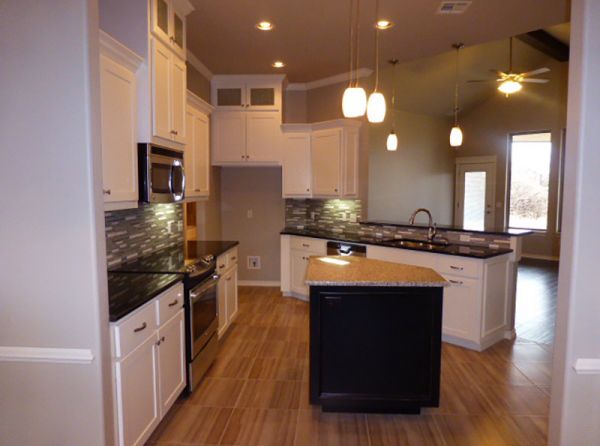 Unique center island design • Arched Openings • Security System • Blinds in Rear Patio Doors